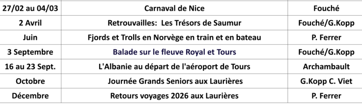 Prévisions de voyages et sorties 2026
